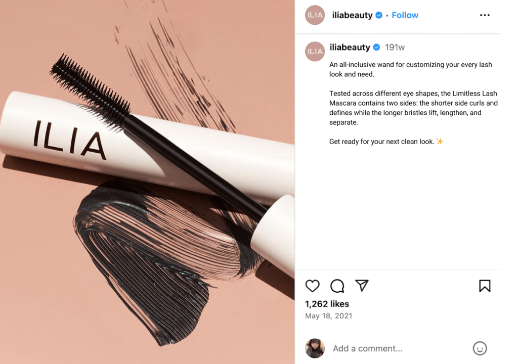 The body copy then shifts into a clear and informative tone, explaining how the product can customize eyelash looks. The ending sentence contains a CTA while reiterating the brand’s “clean” aesthetic.