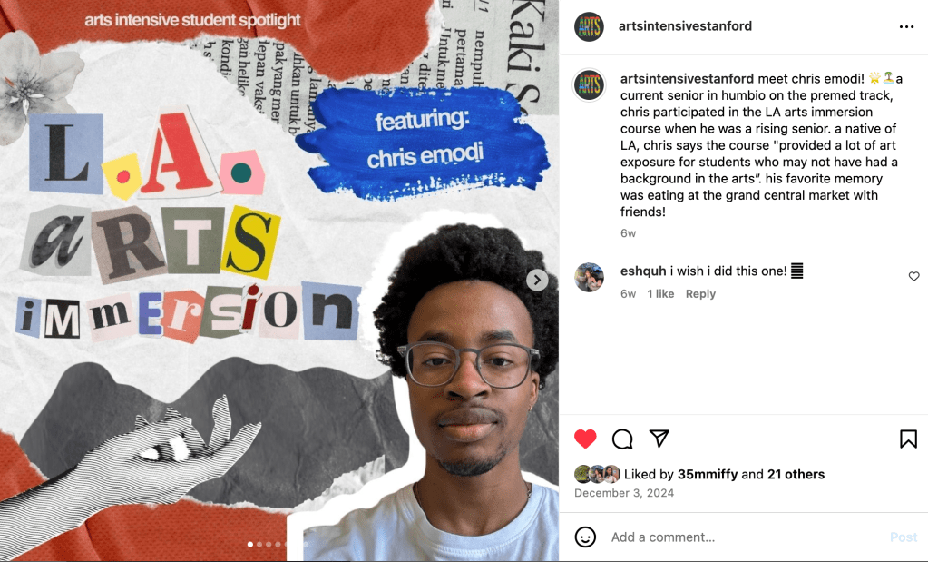 As Marketing Assistant for Stanford Arts Intensive, I organized 10+ outreach events. For promoting both the events and our program, I wrote email newsletters, poster, and social media copy.