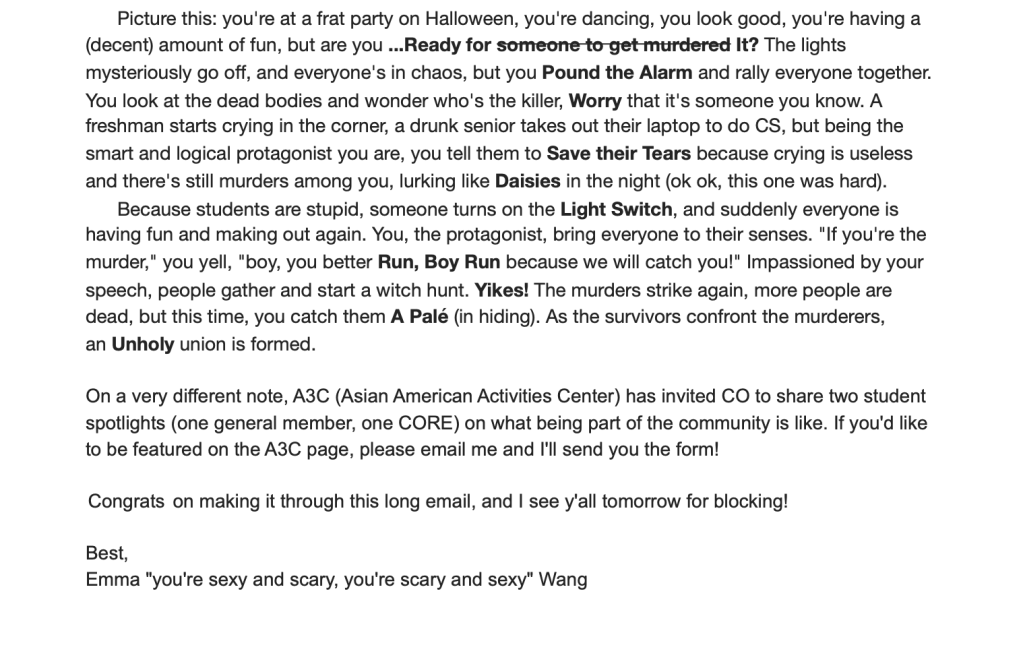 Last year’s artistic theme, emotionally healing from COVID, led me to reflect that Stanford students now want fun and excitement after quarantine. I thus came up with our theme: Hot Girl Horror, combining sexy and scary.